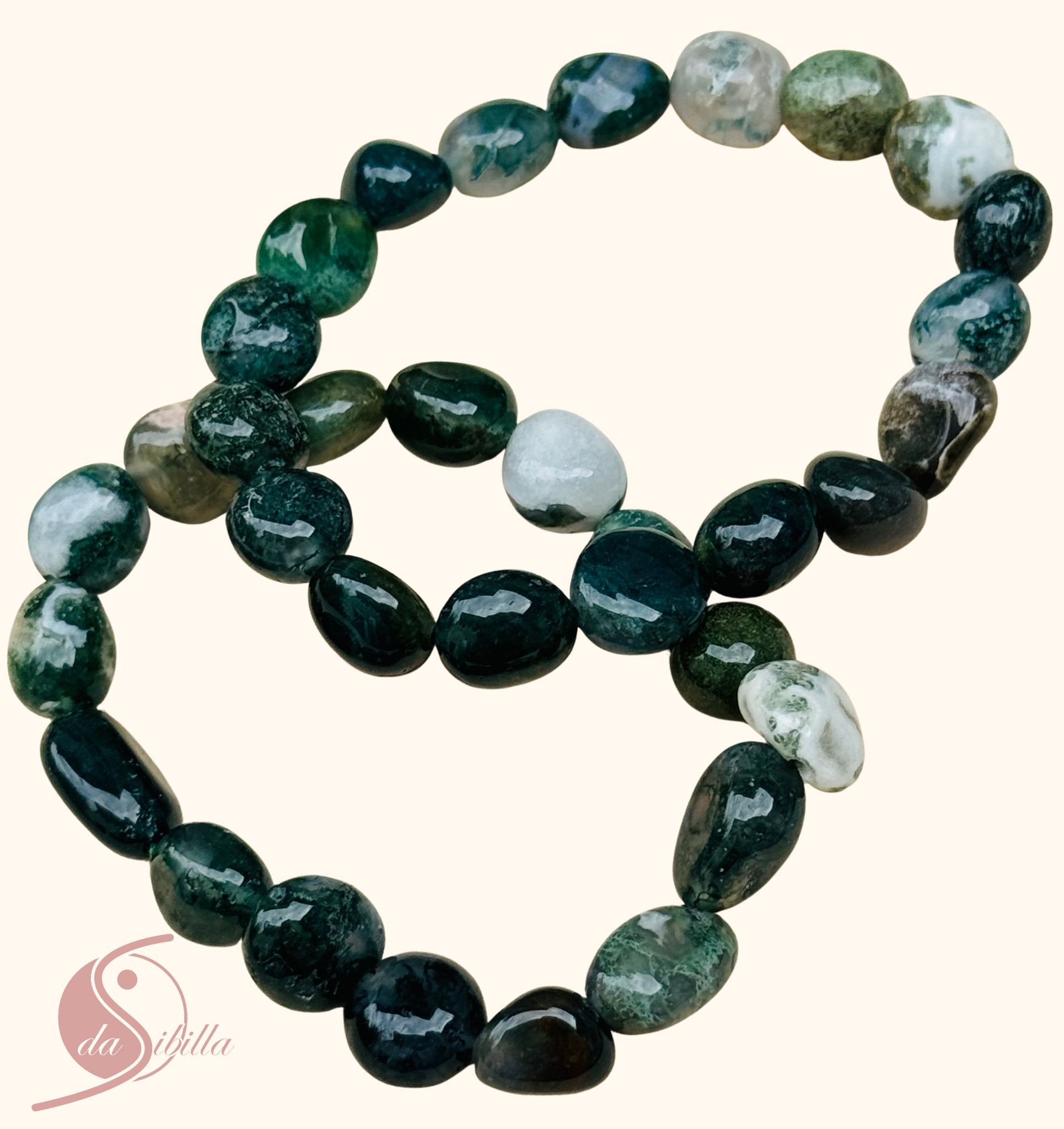 Dieses Armband aus echten Moosachat-Nuggets verbindet die natürliche Kraft des Steins mit einem harmonischen Design. Die grünlich durchscheinenden Nuggets wirken lebendig und lassen sich wunderbar mit anderen Formen und Schmuckstücken kombinieren.