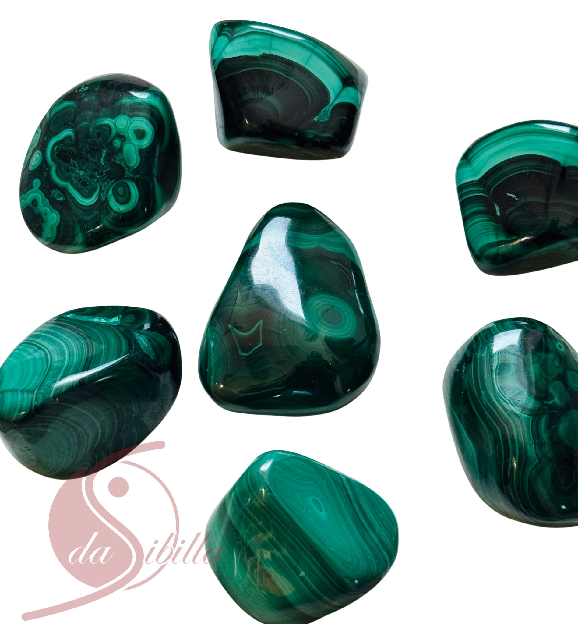 Diese extra großen, kraftvoll polierten Malachit-Trommelsteine messen ca. 3 bis 5cm und stammen aus der Region Zaire (heute Demokratische Republik Kongo).