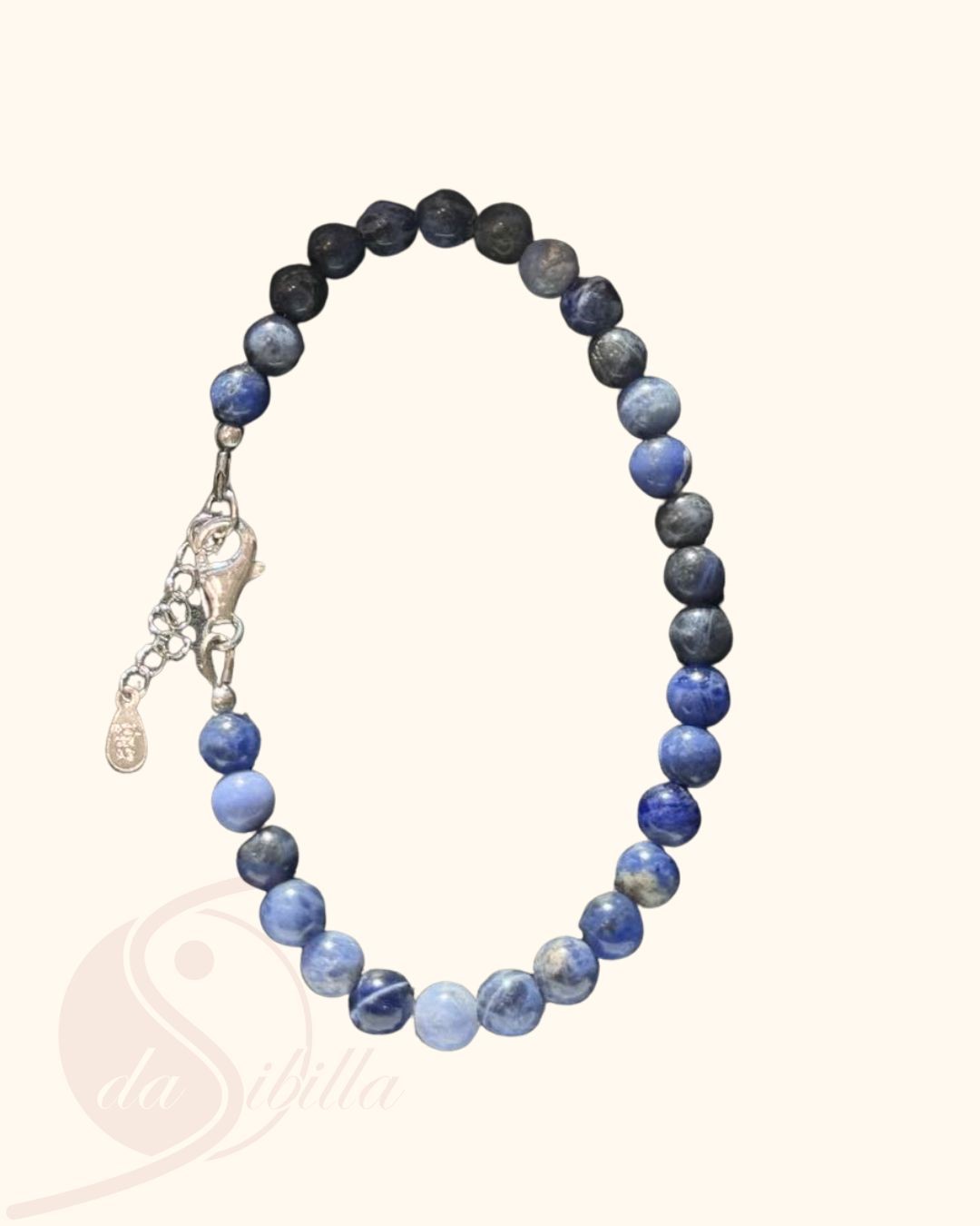 Dieses elegante Kugelarmband aus Sodalith vereint klassische Schönheit mit funktionalem Komfort. Die fein geschliffenen 6 mm Sodalith-Kugeln zeigen sich in einem intensiven Tiefblau mit naturweißer Maserung – harmonisch, kraftvoll und stilvoll.