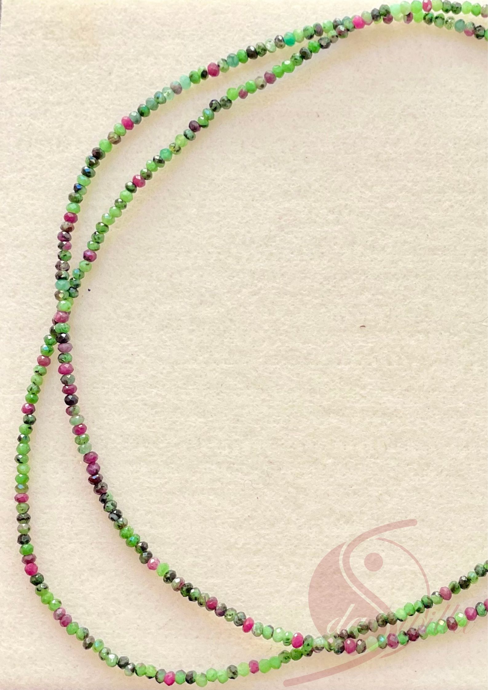 Zweifach kraftvoll – diese elegante Kette aus Zoisit mit Rubin besteht aus zwei Reihen fein facettierter 2x3mm-Buttons, die lebendig im Licht schimmern. Der Edelstein verbindet das tiefe Grün des Zoisits mit der feurigen Energie des Rubins und steht in der Steinheilkunde für Regeneration, innere Stärke und schöpferischen Ausdruck.