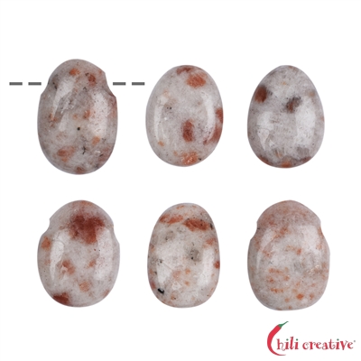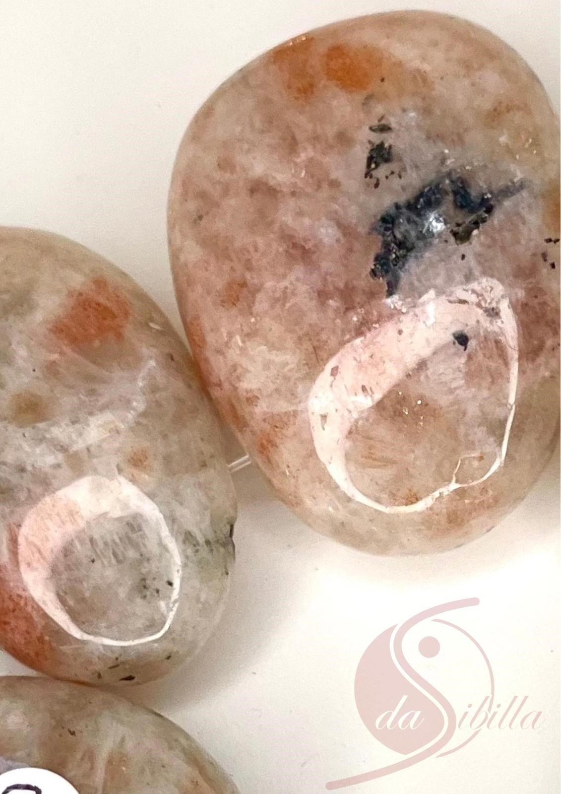 Der Sonnenstein Trommelstein, mit einer Größe von ca. 2,5–3,0 cm, wurde sorgfältig geschliffen und besitzt eine Bohrung von ca. 2,2 mm, ideal für Lederbänder oder feine Ketten.