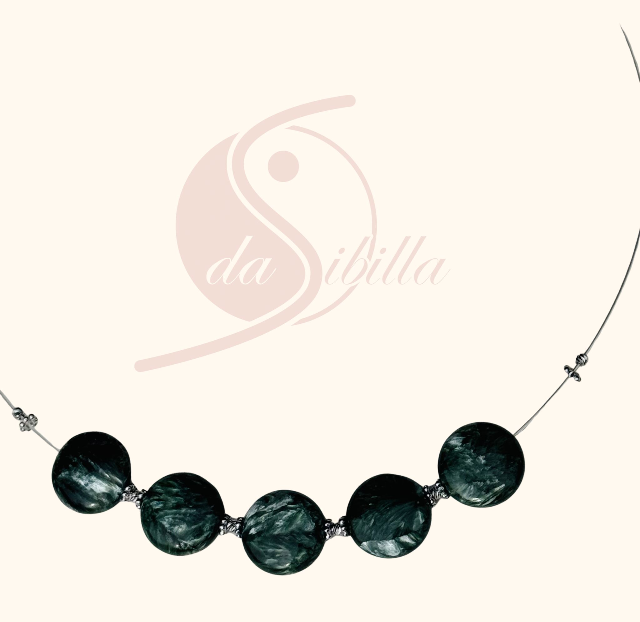 Ein Collier mit klarer Präsenz: Dieses edle Serafinit-Design besteht aus fünf hochglanzpolierten Coins mit je ca. 16 mm (Gesamtgewicht ca. 61,6 ct). Zwischen den Steinen befinden sich stilvolle Zwischenteile aus rhodiniertem Silber (925), das zusätzlich durch das Verlängerungskettchen ergänzt wird. Silbergesamtgewicht: 2,2 g.